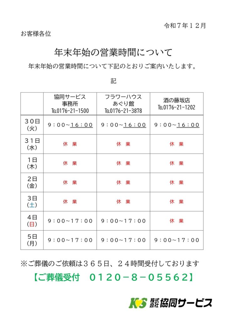 誠に勝手ではございますが、年末年始の営業時間を下記の通り変更させていただきます。お客様には御不便をお掛けしますが、何卒御理解くださいますようお願いいたします。記